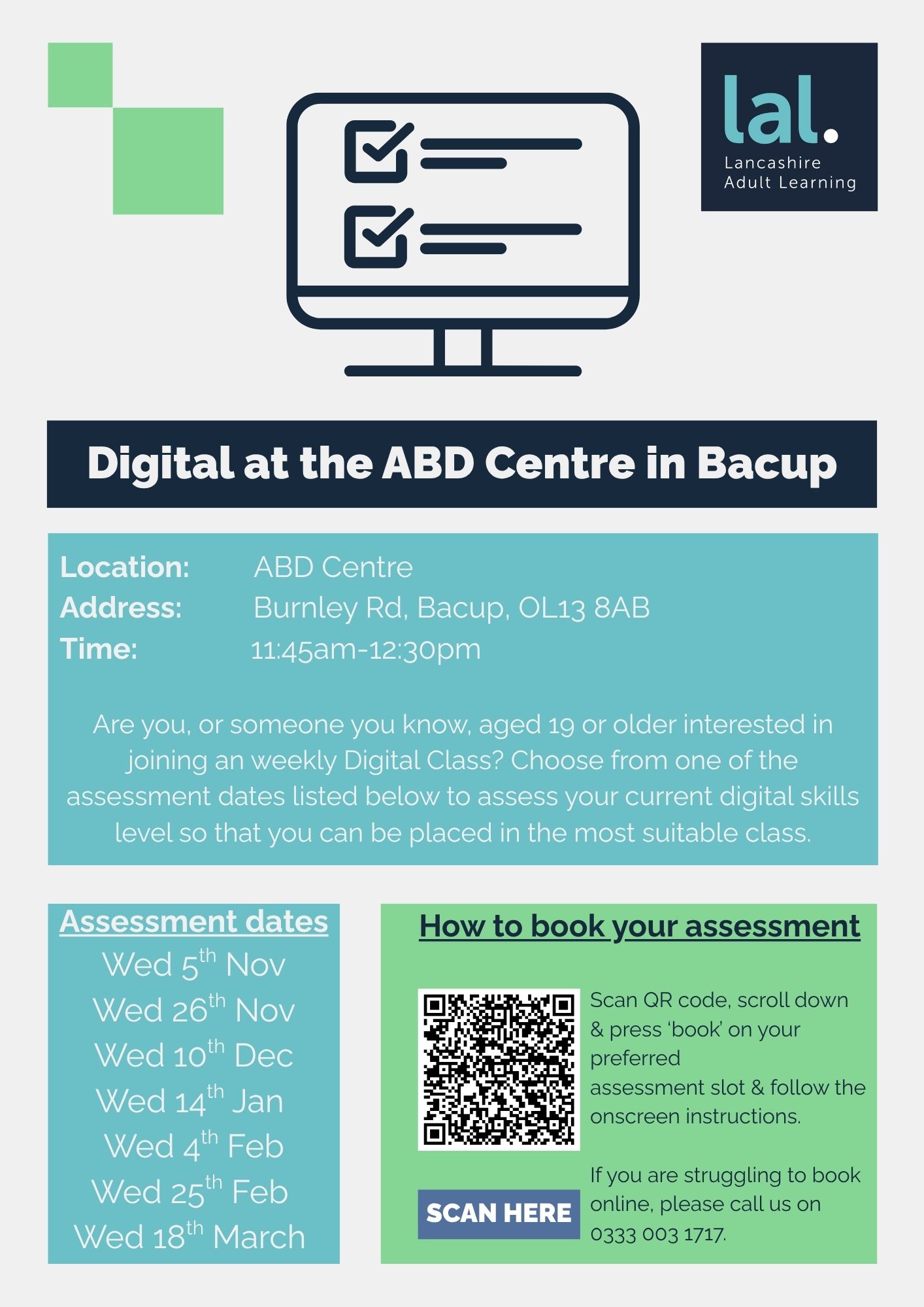 Scan the QR code to book, or call the number shown at the bottom of the leaflet to get in touch with someone from Lancashire Adult Learning.