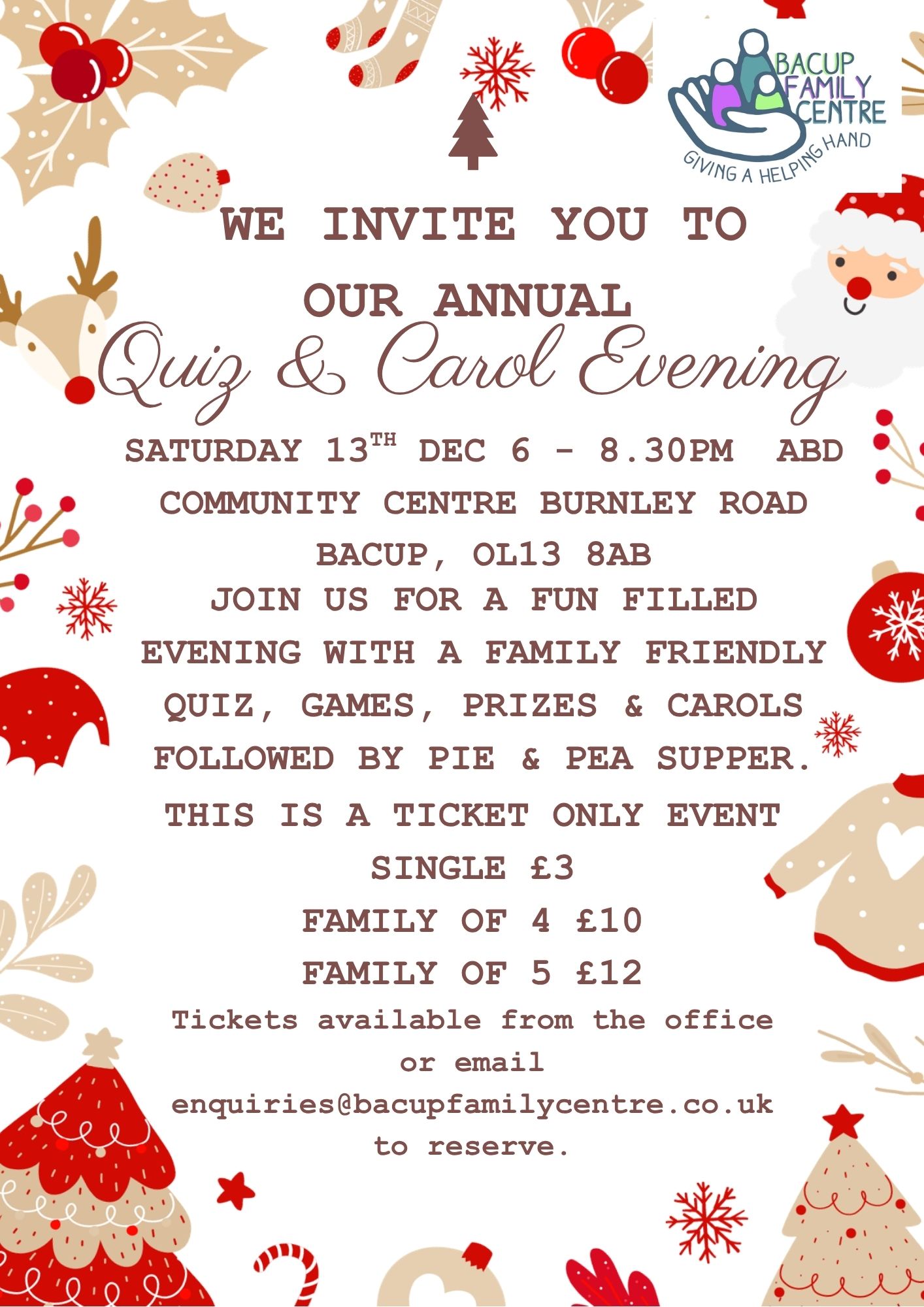 To reserve / pay for tickets please send an e-mail to enquiries@bacupfamilycentre.co.uk or pop by the office. This sells out every year so get your tickets asap to avoid disappointment!